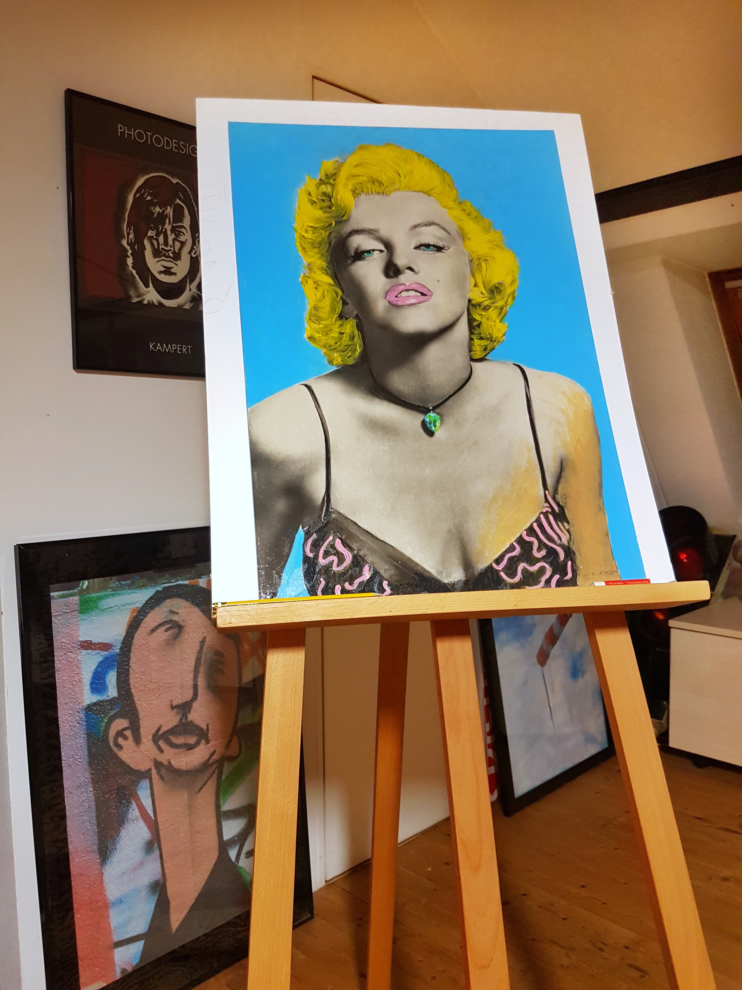 Ich zu Stella:“ Wech damit?“ Stella: „Runter damit!“Also runter damit. Die vier Heftzwecken machten es mir nicht leicht, aber dann tauchte hinter der völlig vergilbten Schutzfolie – uaaahh – ein bis auf 4 Pinnlöcher weitgehend intaktes schwarz weiß Poster auf. Es war leicht wellig, aber kam mir trotzdem plötzlich zu schade zum Wegwerfen vor… Es hing halt am falschen Platz. Und dieser furchtbare 80er Jahre Schriftzug Marilyn Monroe in pink orange…als würde sie nicht ohnehin jeder kennen. Ich plante eine Rettungsaktion. Stabilisieren und glätten durch Aufziehen auf Forex Karton… und es brauchte Farbe!