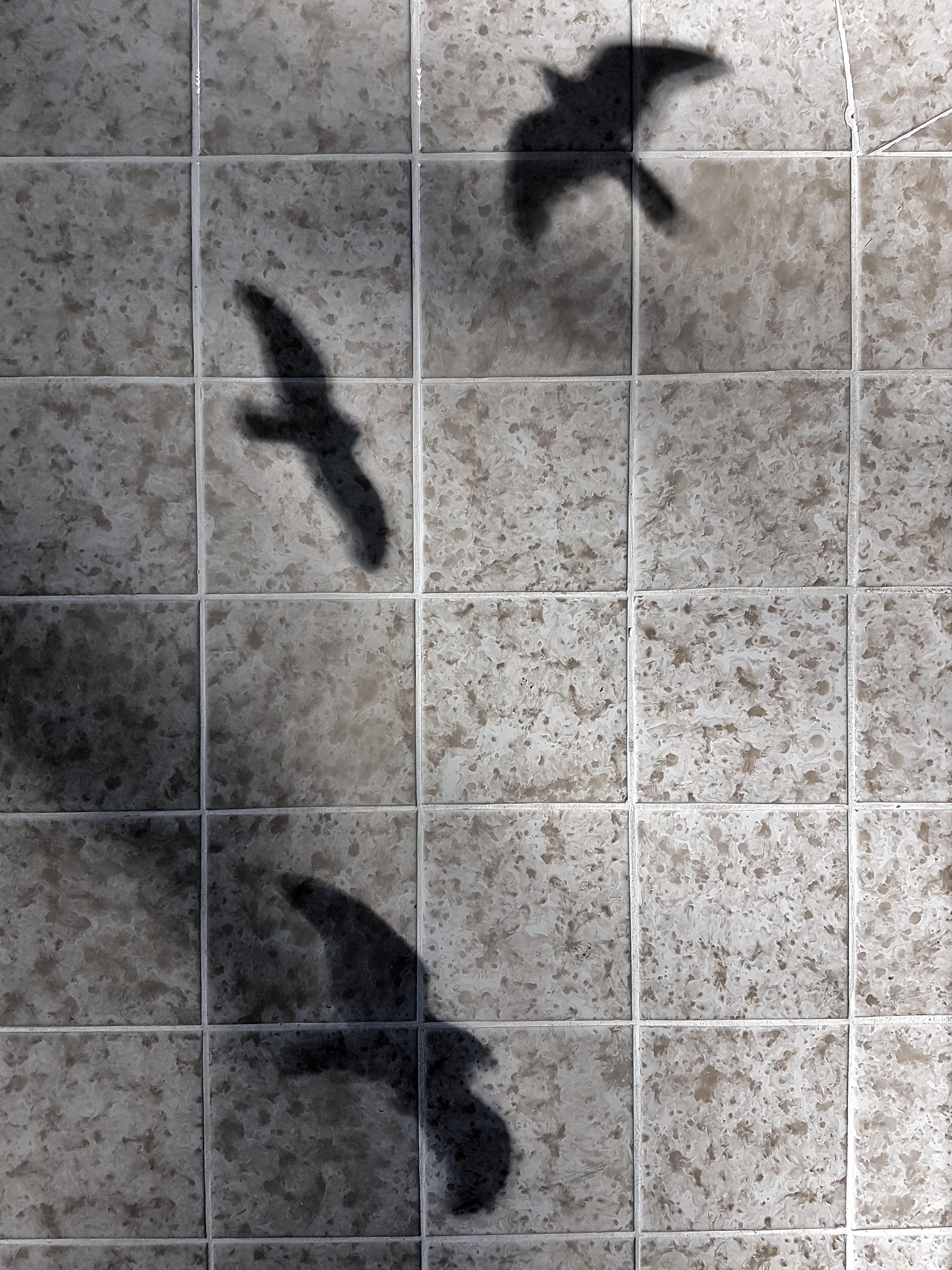 Wir hatten im Laufe der Jahre einige Tauben, die die Fenster im Hausflur nicht erkannt hatten und dagegen geflogen sind… sieht man an fettigen und staubigen Abdrücken an der Außenseite der Scheiben. In einem Fall fanden wir eine tote Taube im Hof. Seitdem kleben dort einige schwarze Aufkleber in Form einer Raubvogelsilhouette, um weitere unangenehme oder gar tödliche Unfälle zu verhindern.Tatsächlich sind es also nur die Schatten von Fenster-Aufklebern.